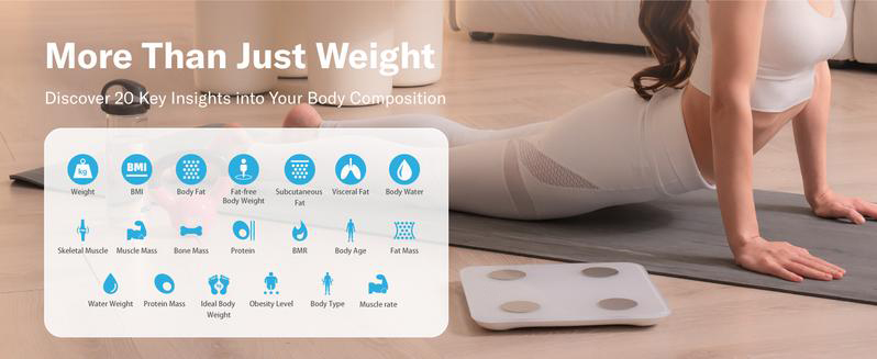 ·Comprehensive Health Tracking: Analyze 20 key body metrics, including weight, body fat, BMI, muscle mass, and more, to gain deep insights into your health.