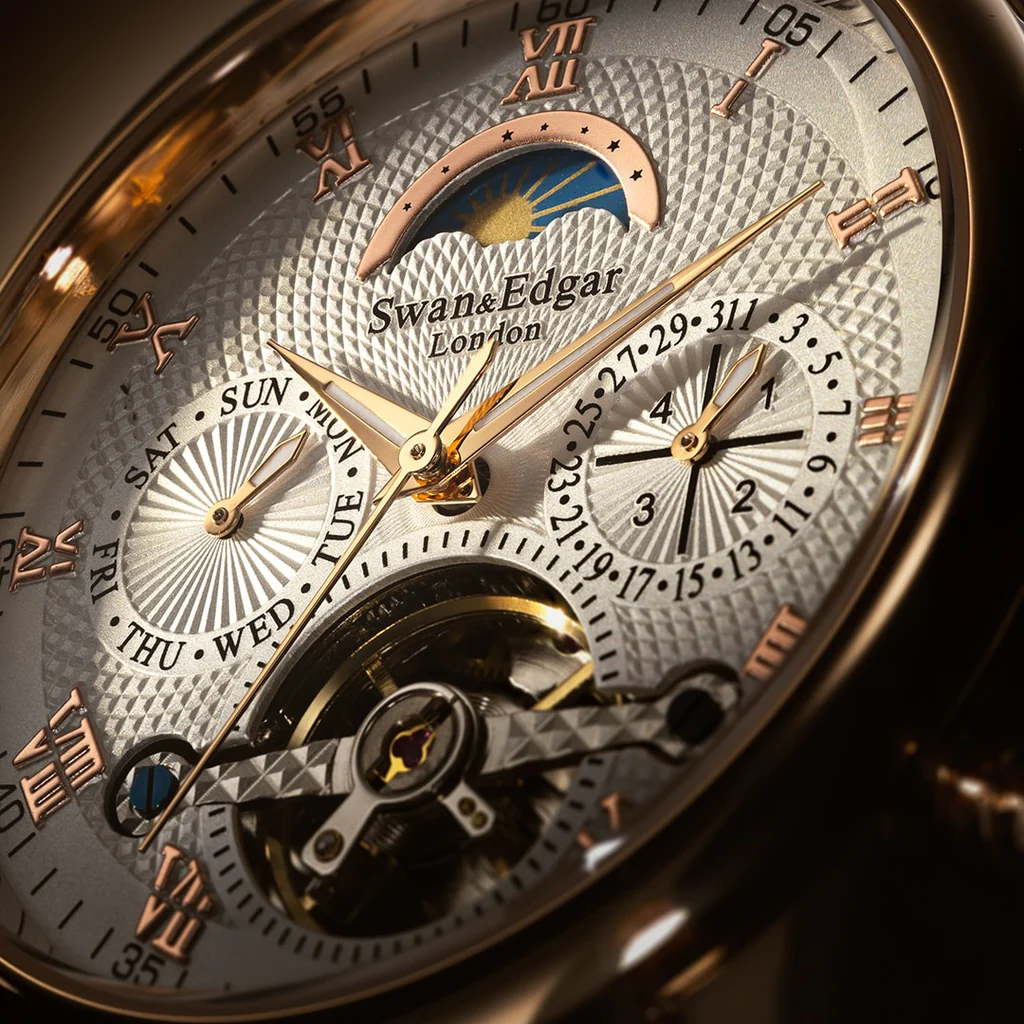 The polished stainless steel case is complemented by a sapphire crystal and a skeletonised case back, revealing the intricate movement within. Attention to detail extends to the serrated edge crown for ease of adjustment and a hand-waxed tobacco brown leather strap, finished with a Swan & Edgar-etched logo buckle, adding a refined touch to this understated, yet luxurious timepiece.