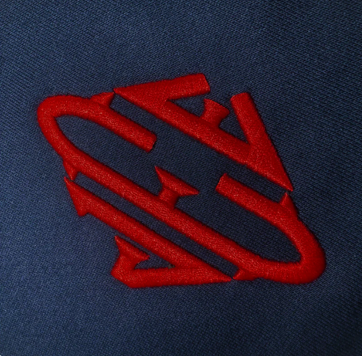 -1:l to the orginal, dark navy blue, rounded zipper andembossed embroidery